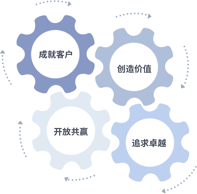 成就客户是一切决策的出发点,创造价值是衡量所有工作的标准,追求卓越是IWBET(做事做人的态度,开放共赢是IWBET(的格局也是最终的结果。价值观的齿轮环环相扣,推动着组织里的每个人不断向前。